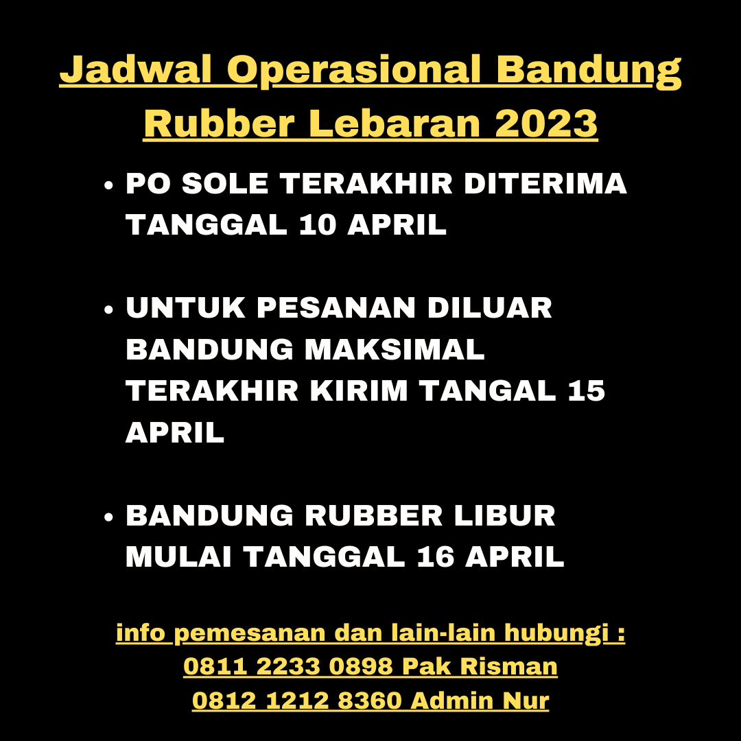 Kami ingin memberitahukan jadwal operasional Bandung Rubber menjelang Lebaran 2023. Bagi yang ingin melakukan pemesanan sol mohon dibantu agar sesegera mungkin menurunkan PO nya dikarenakan untuk mengejar jadwal pengiriman ekspedisi untuk customer yang diluar Bandung.